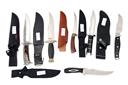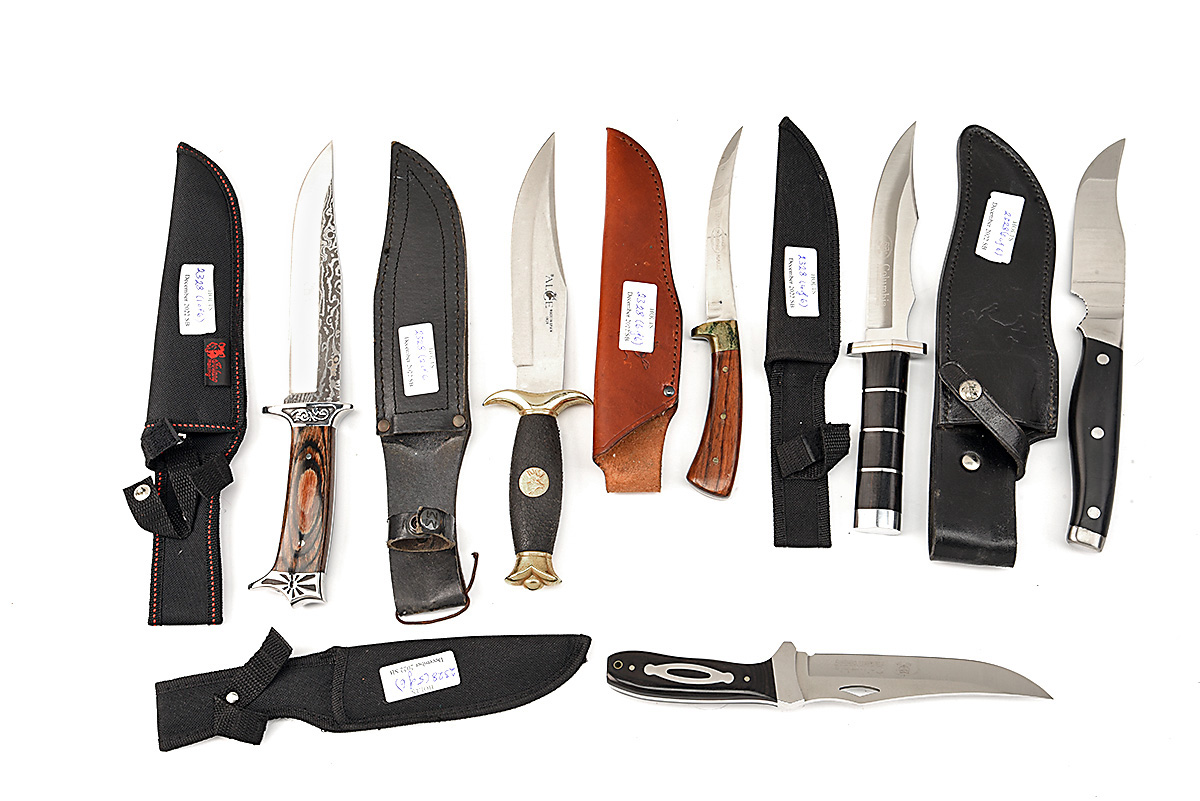 SIX ASSORTED LARGE SHEATH KNIVES VARIOUS STYLES, two with wide 7 in blades, three with 6 in blades and on with 4 1/2 in blade, various styles and shapes complete with leather sheaths