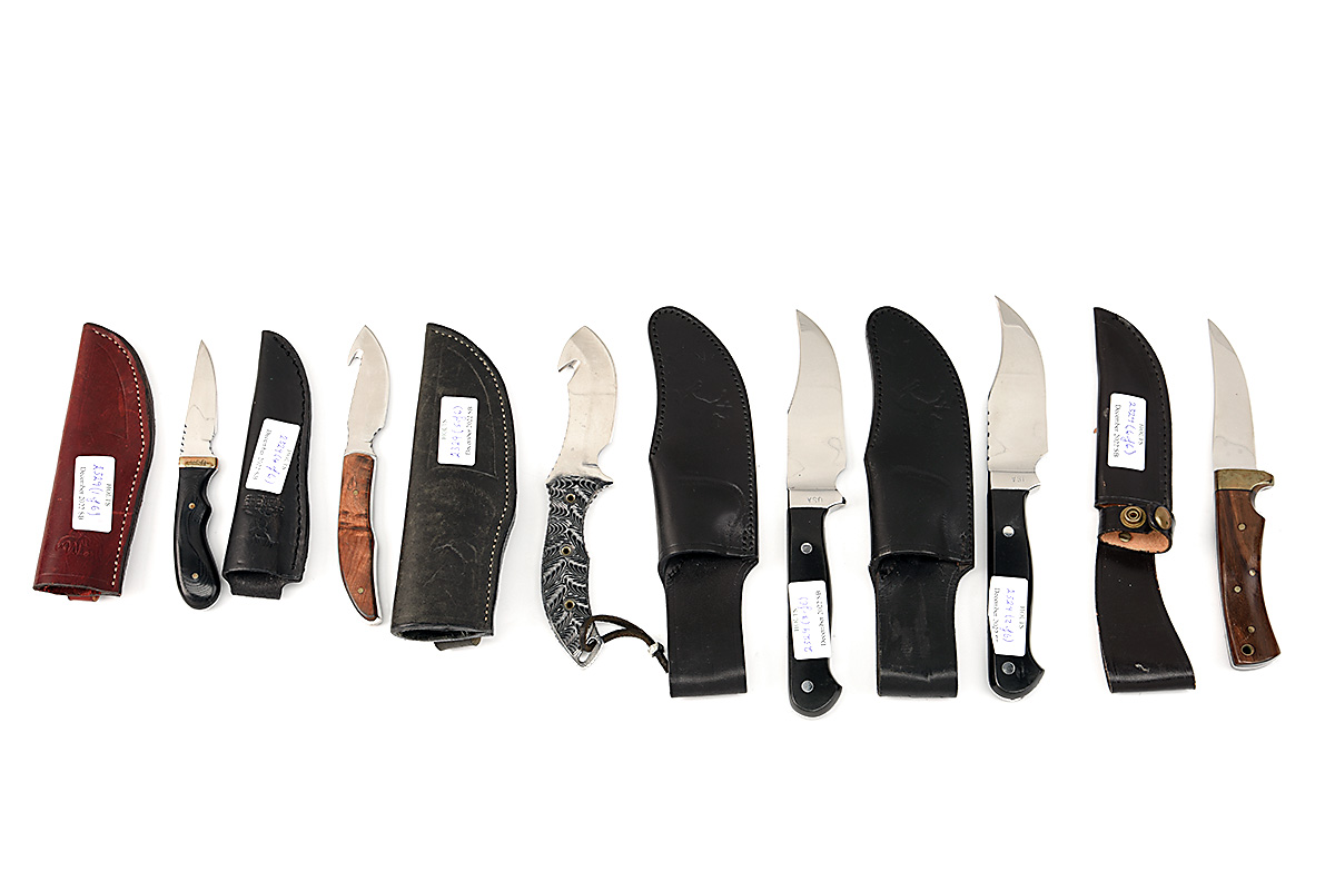 SIX ASSORTED SHEATH KNIVES VARIOUS FORMS AND STYLES, two with 4 1/2 in wide blades, three with 3 3/4 in blades and two with 3 in blades, various styles of hilts and grips, all with leather scabbards and unused