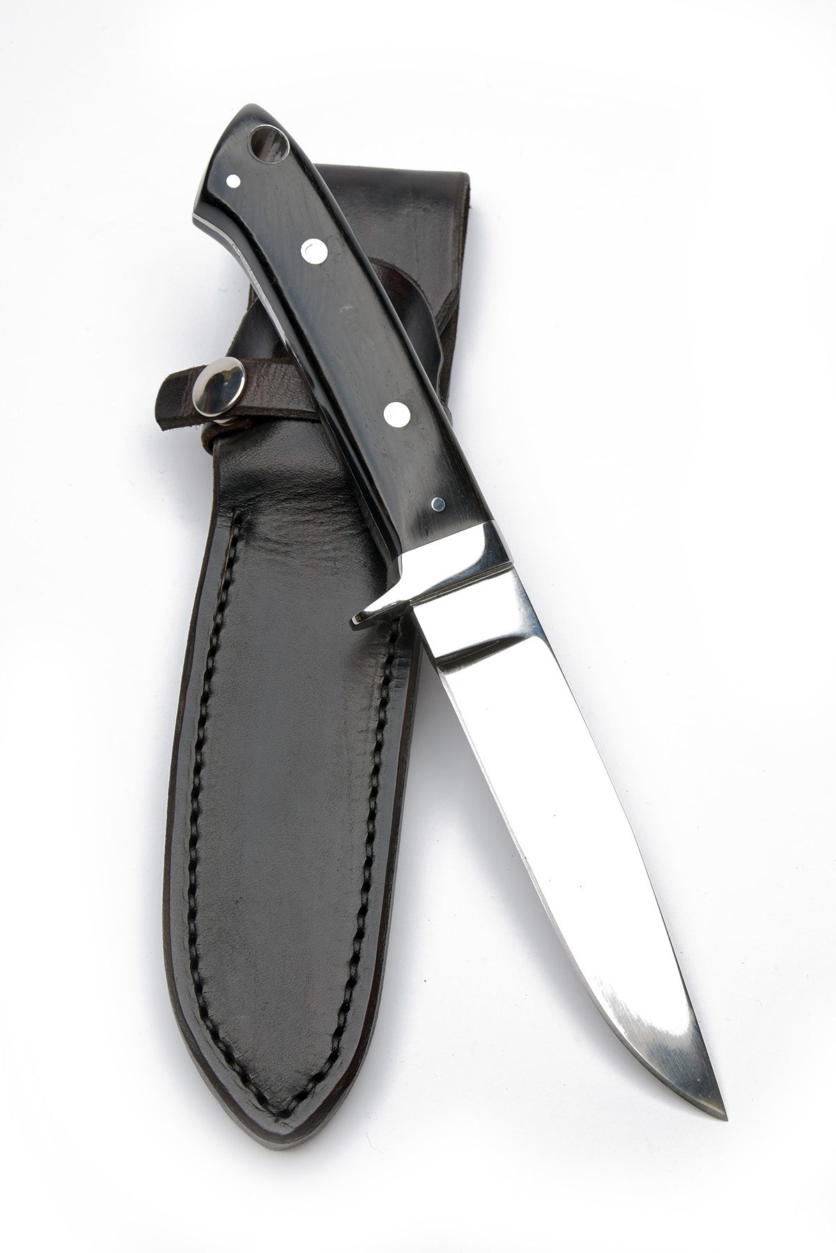 A HANDMADE SPORTING KNIFE SIGNED RORY CONNOR, with drop-point 4 1/2in. signed blade, solid tang, smooth wood scales and complete with its leather scabbard
