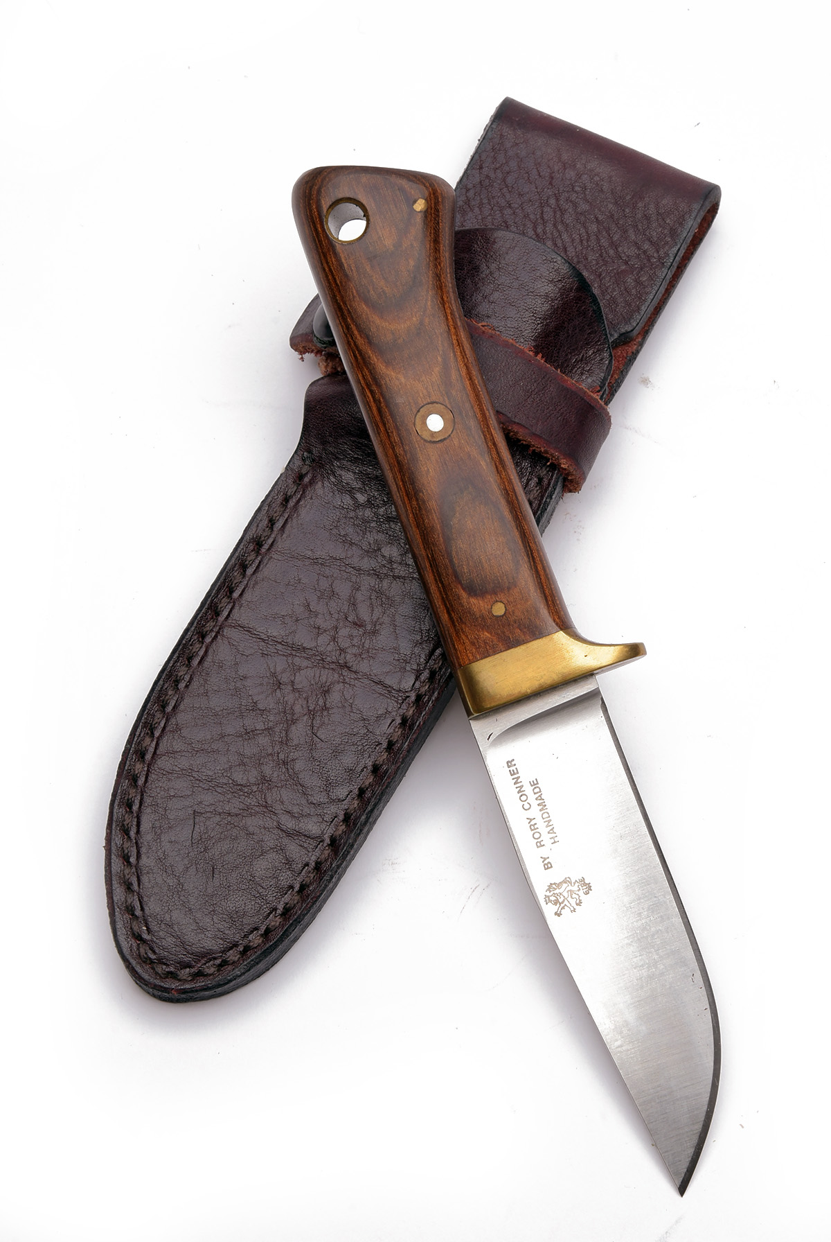 A SPORTING KNIFE SIGNED RORY CONNOR, with drop-point 4in. blade, brass guard and smooth wood scales, complete with scabbard