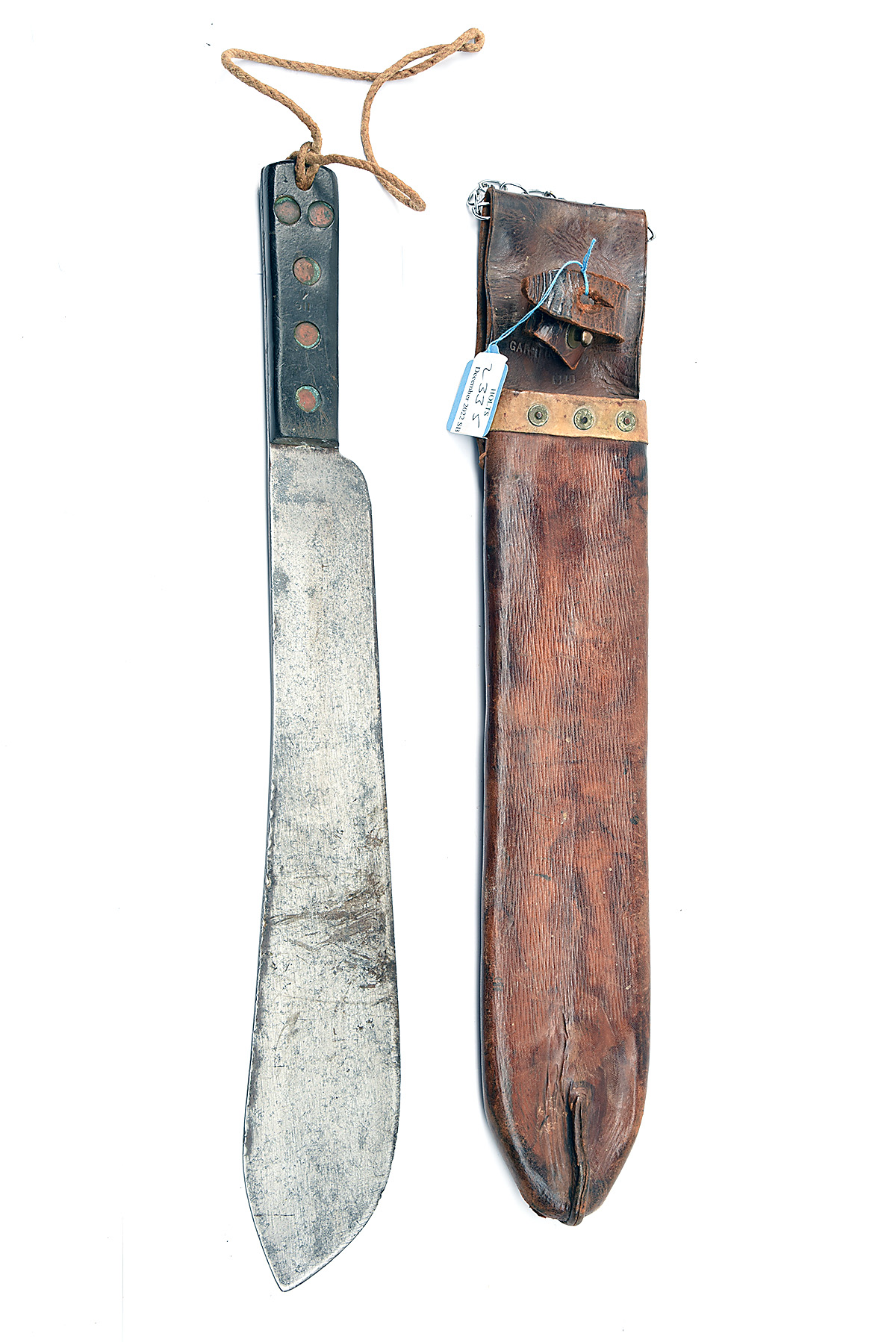 A WORLD WAR II MARK II JUNGLE MACHETE BY MARTINDALE, early 1940s, with 15 in. steel blade stamped 'MARTINDALE / BIRMINGHAM / ENGLAND / MADE IN ENGLAND / No. 227' plus the Martindale crocodile trademark, rivited black bakelite grips marked with the Broad Arrow and '119', together with its original brown leather scabbard marked 'GARSTIN ,LONDON / 1940', 20 in. overall
