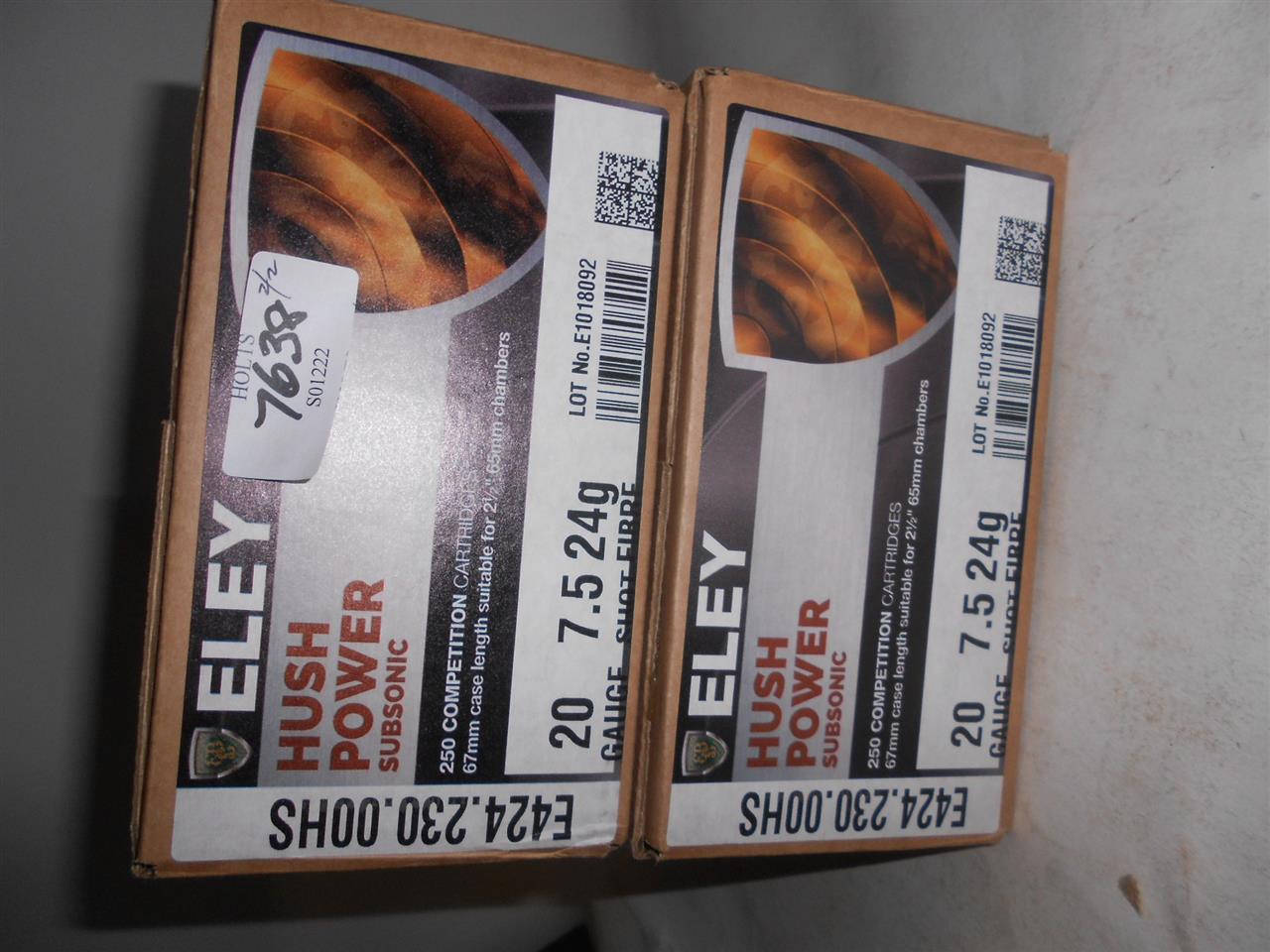 500 ELEY HUSHPOWER 20 BORE CARTRIDGES, 65mm, 24grm, 7.5 SHOT, FIBRE WAD. Please be advised that cartridges/ammunition, primers, primed cases, blanks and percussion caps cannot be sent or exported to you by post or carrier. Due to this rule, within 30 days of the sale date, please arrange with our shipping department a collection at one of our regional valuation days on mainland UK, or, you would be most welcome to collect from our offices at PE31 6HA in Norfolk. If collection is not arranged within 30 days, that will indicate that the items are not required and they will be offered in our next sale.