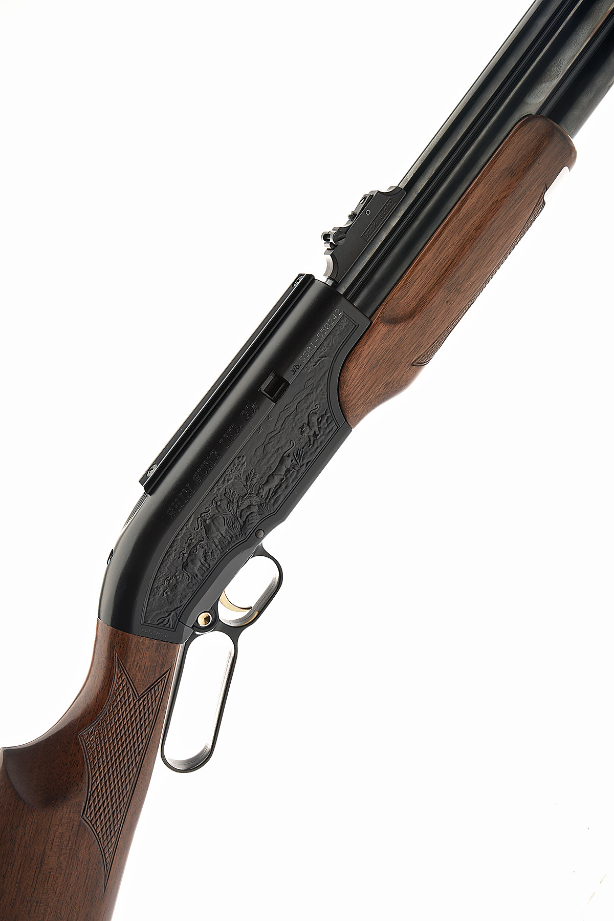 AN F.A.C. RATED .22 PRE-CHARGED PNEUMATIC AIR-RIFLE, SIGNED SHIN SUNG IND. 'MODEL CAREER II 707'. serial no. SS01-550242, 24in. barrel with ramped blade fore-sight with tunnel protector, ramped open rear sight, with sound moderator and muzzle thread cap, receiver with sight rail, detachable magazine (present), manual push-button safety, lever action operation, gold-washed trigger, chequered butt stock, 13 1/2in. pull including rubber recoil pad, in its slip with instructions and filler adapter, untested plus moderator