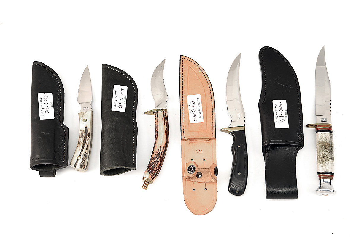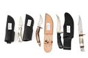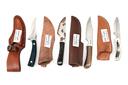EIGHT ASSORTED SHEATH KNIVES VARIOUS TYPES AND STYLES, blade lengths from 3 in. to 5 in. in various shapes, grips of different styles and materials, all with leather sheaths