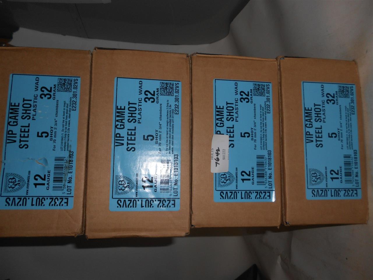1000 ELEY STEEL VIP GAME CARTRIDGES, 70mm, 32grm, STEEL 5 SHOT, PLASWAD Please be advised that cartridges/ammunition, primers, primed cases, blanks and percussion caps cannot be sent or exported to you by post or carrier. Due to this rule, within 30 days of the sale date, please arrange with our shipping department a collection at one of our regional valuation days on mainland UK, or, you would be most welcome to collect from our offices at PE31 6HA in Norfolk. If collection is not arranged within 30 days, that will indicate that the items are not required and they will be offered in our next sale.