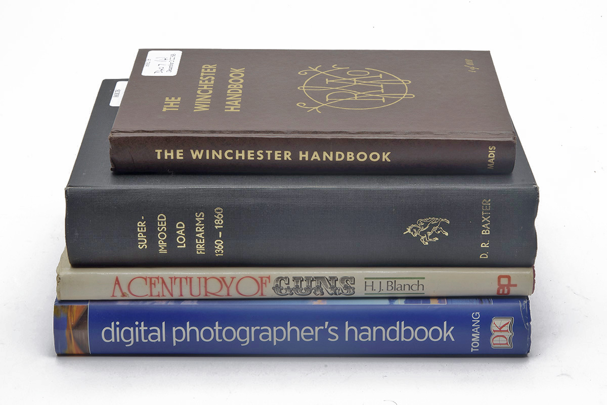 A COLLECTION OF FOUR SHOOTING AND PHOTOGRAPHY BOOKS, 'Superimposed load firearms 1360 - 1860 by d. r. Baxter no. 436 of 500, The Winchester handbook signed by author George maids, A century of guns by h. j. blanch, Digital photographer's handbook'