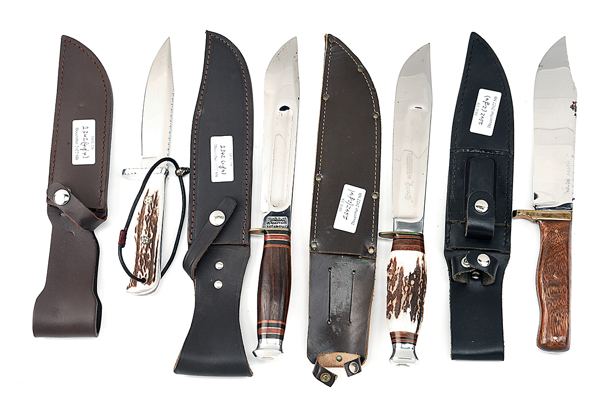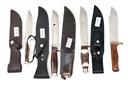 FOUR SMALL BOWIE KNIVES OF VARIOUS SIZES AND GRIP STYLES, the first with 8 in. blade etched 'J. NOWELL & SONS, / SHEFFIELD ENGLAND / ESTABLISHED 1700' and 'BOWIE' with staghorn grip and brown leather sheath, i, the second with 7 in. blade marked 'HARRY BODEN' two piece wood grips, with leather sheath, the third with 5 1/2 in blade and faux staghorn grip, in leather sheath, the fourth with 8 in blade stamped 'JOHN NOWELL & SONS' with one piece wooden grips and leather scabbard, all in as new or near new condition