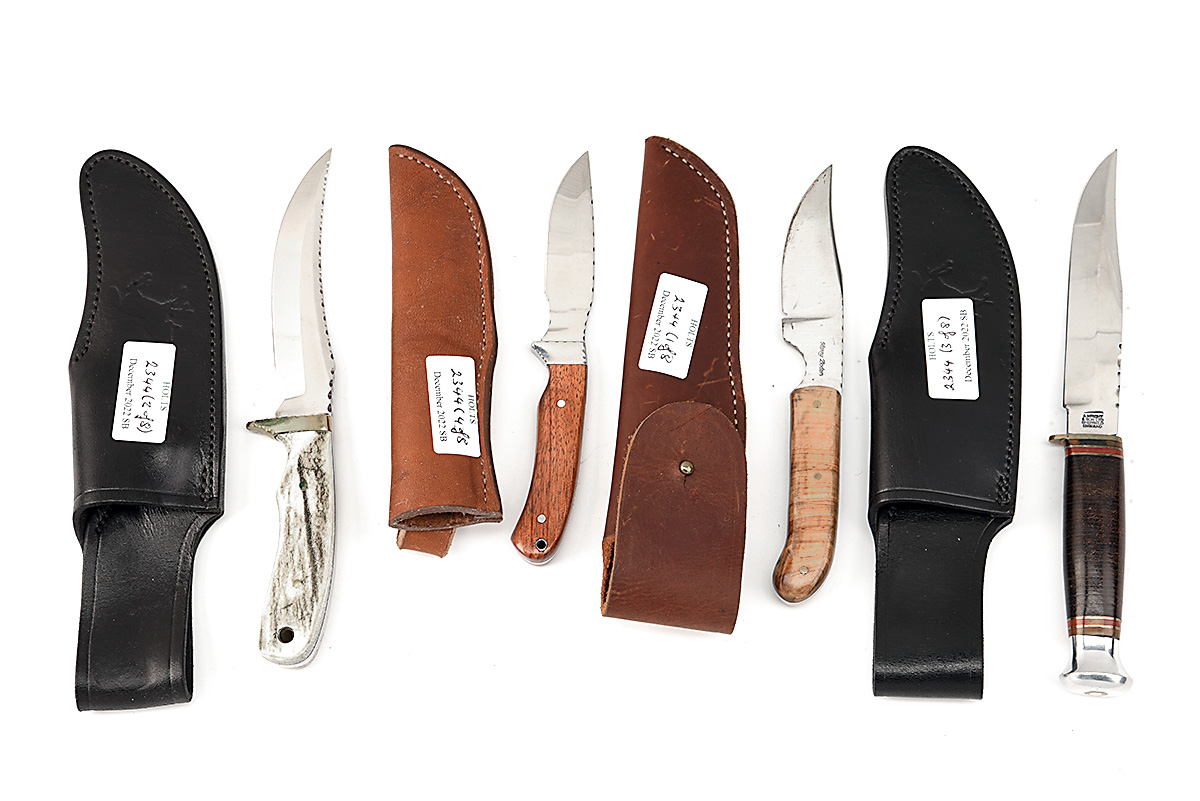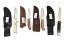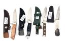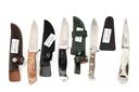 EIGHT ASSORTED SHEATH KNIVES OF VARIOUS SIZES, TYPES AND STYLES, blade lengths from 3 1/2 in to 7 in, varied grips of wood, compressed leather, faux staghorn etc, all near new and with scabbards.