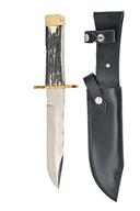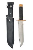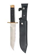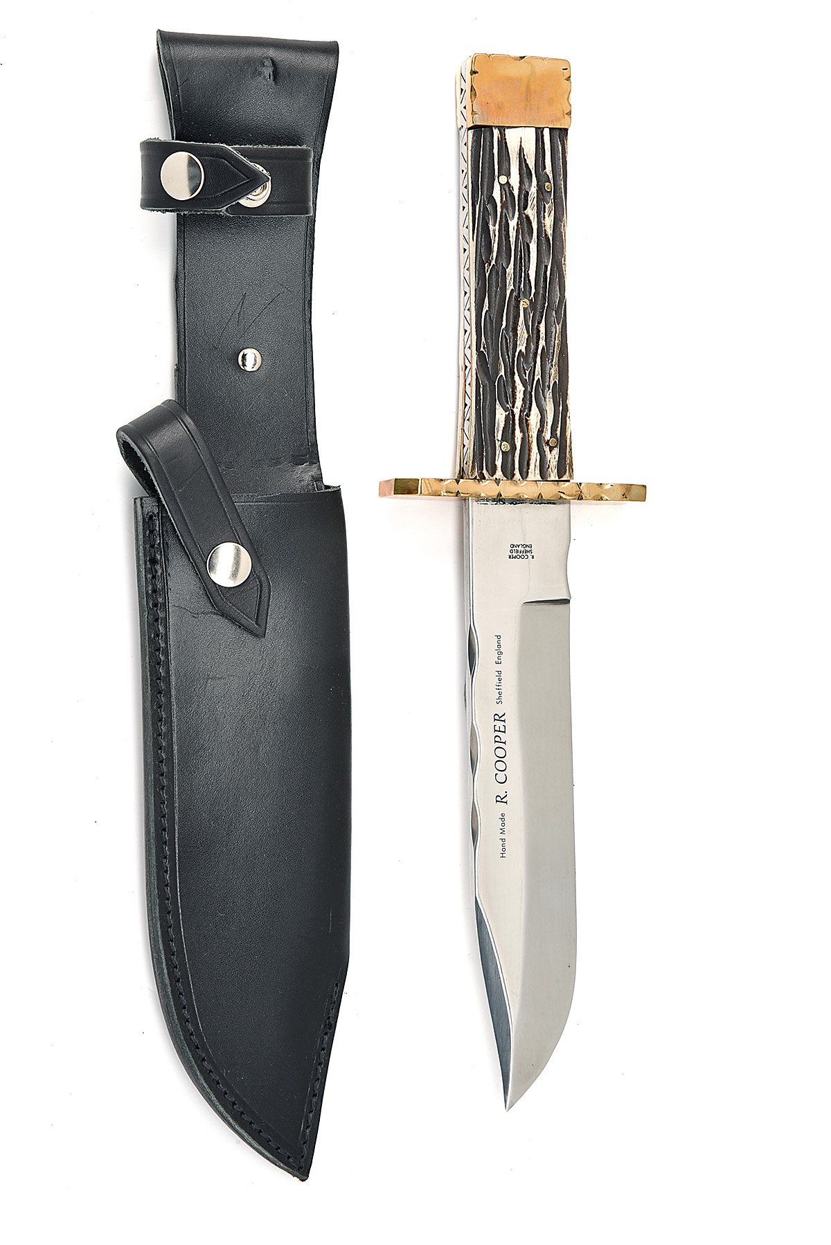 TWO LARGE HAND CRAFTED ENGLISH BOWIE KNIVES BY R. COOPER BOTH AS NEW AND IN ORIGINAL WRAPPING, the first with 10 in. blade etched 'HAND MADE R. COOPER SHEFFIELD ENGLAND', the second with 8 in. blade and same markings as first, with two piece staghorn grips, both with black leather scabbards, both as new and in original wrapping