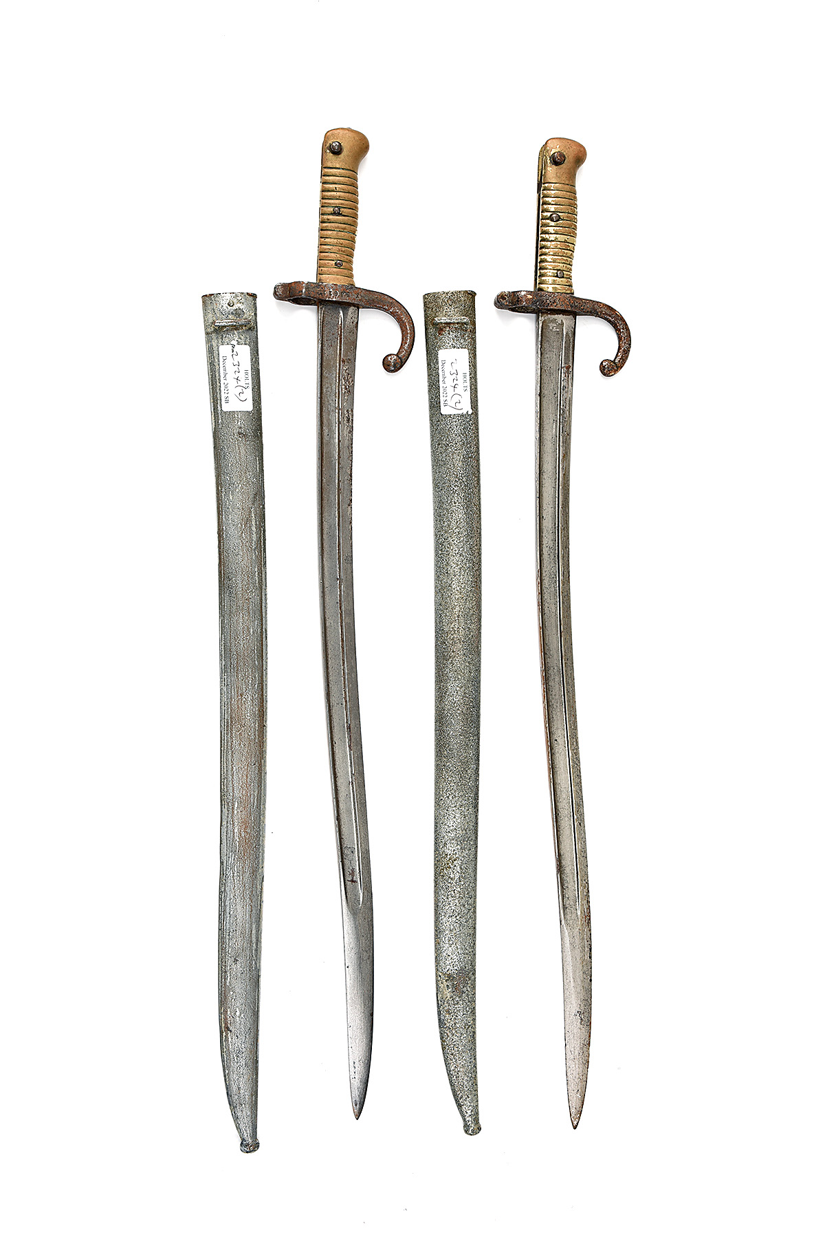 A PAIR OF FRENCH MODEL 1866 CHASSEPOT BAYONETS, circa 1870s, with 22 1/2 in. single-edged steel blades fullered on each side, steel cross-guards, brass hilts, with their silver-painted steel scabbards; 1) dated 1873, blade back etched for Chatellerault arsenal, blade with rusting towards the tip, exposed steel rusted and pitted, scabbard rusted and pitted; 2) ricasso marked with a circled 'P', no inscription on blade back, cross-guard numbered 'K 58611', cross-guard rusted and pitted, scabbard rusted and pitted, each 28 in. overall