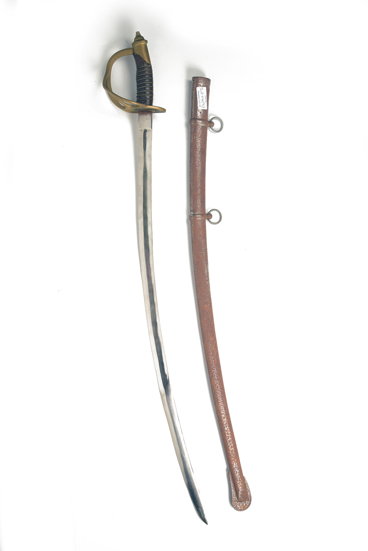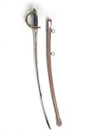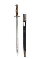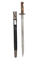 A PATTERN 1907 SWORD BAYONET AND A REPRODUCTION UNITED STATES MODEL 1860 CAVALRY SABRE, bayonet dated 1916, with 16 3/4 in. single-edged steel blade fullered on each side, ricasso marked '1907 / 4 '16 / J A C' [for James A. Chapman] with Broad Arrow and inspection marks over, steel hilt with wooden grips, together with its b;lack leather scabbard with steel fittings, worn, blade polished clean, exposed steel rusted, grips with losses, scabbard fittings pitted and dented, 22 1/2 in. overall, plus an Indian-made reproduction American Civil War M1860 sabre with 34 1/2 in. single-edged curved steel blade, brass hilt and guard with brown leather grip bound with brass wire, together with its steel scabbard, scabbard with surface rust, 45 in. overall