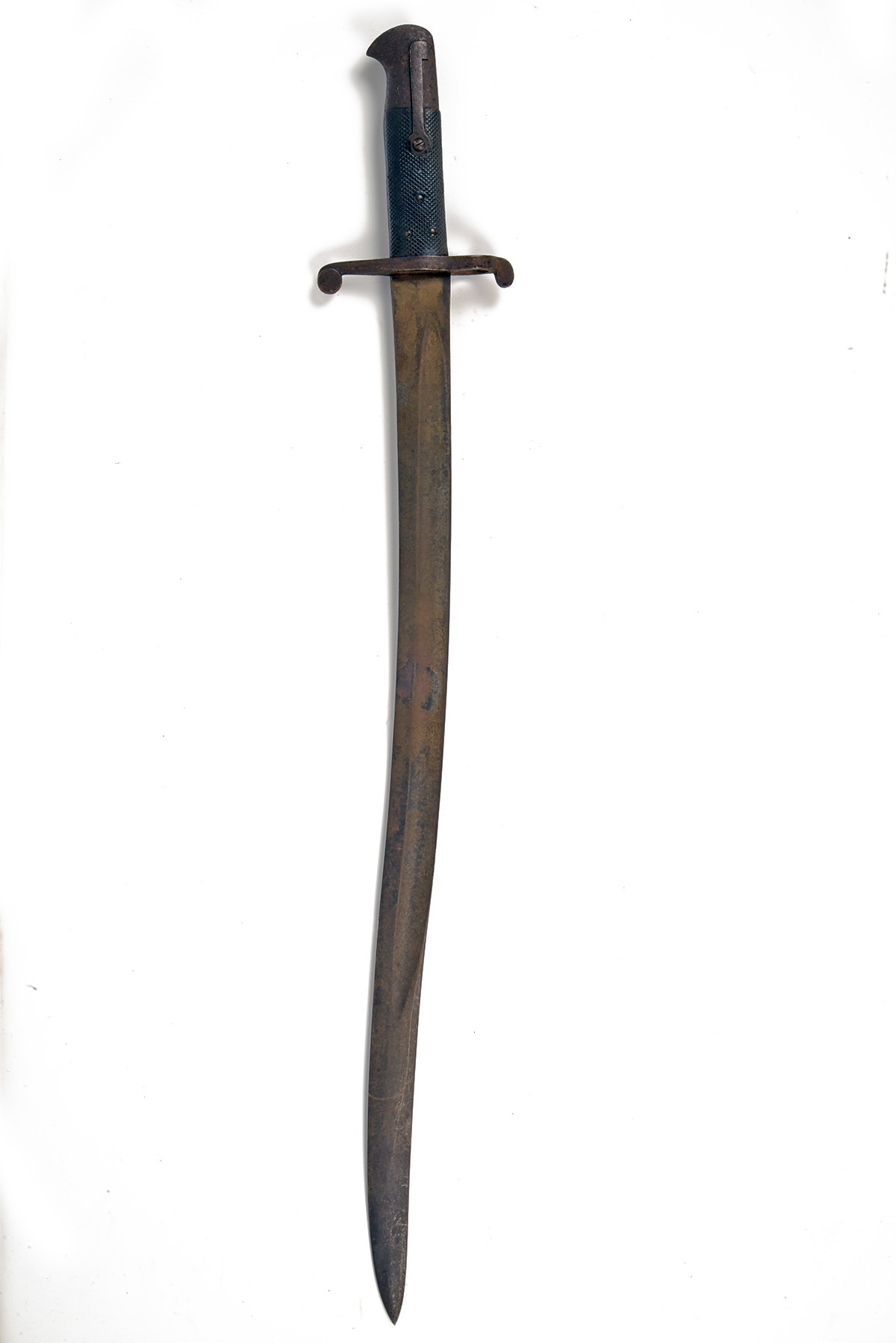 A PATTERN 1853 YATAGHAN SWORD BAYONET FOR THE 1853 ENFIELD RIFLE, circa 1850s, with 23 in. blade fullered on both sides, no apparent markings, steel cross-guard and hilt with black chequered compressed leather grips, stained blade, rusted and pitted cross-guard and hilt, 28 in. overall