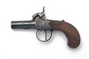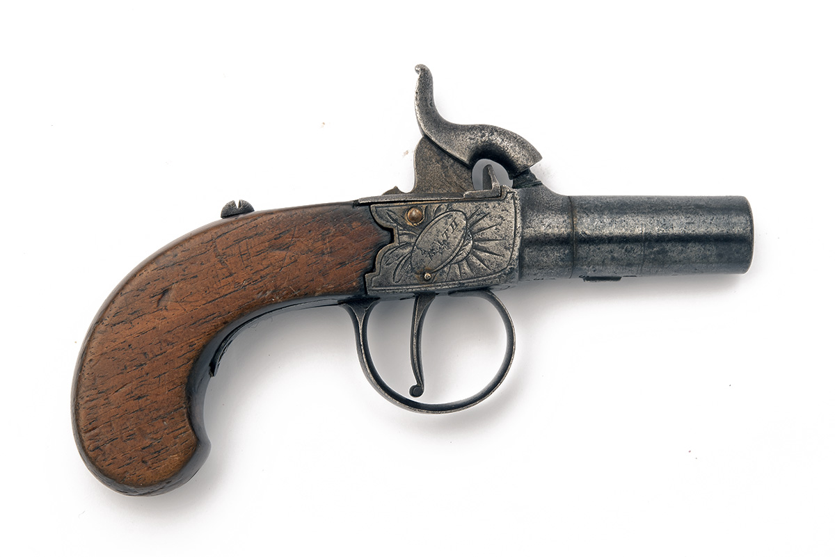 A .45 PERCUSSION BOXLOCK POCKET PISTOL BY COOKE OF BATH, CIRCA 1840, no visible serial number, with 2 in. Birmingham proofed barrel, engraved and decorated boxlock action with central ovals, the one on the right engraved 'BATH' and 'COOK' on the left, central hammer, one piece walnut slab sided grips