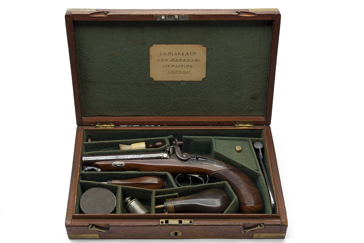 with 5 1/2in. browned barrels the top rib inscribed 'LONDON', and with two inlaid gold lines at breech, and fitted with a swivelling hinged rammer at muzzle, foliate engraved fixed breech, border decorated curved back-action locks superbly scroll engraved and bearing makers name 'J. A. BLAKE & Co', the hammers engraved to match, both locks are fitted with bolt safeties, figured full walnut stock with chequered bag shaped grip, iron trigger-guard with foliate engraved bow having virtually all its original charcoal blue finish, with almost all its original finish and case colours to fixed breech, locks and hammers, brown to barrel, contained in its original brass cornered mahogany green baize lined and partitioned case, the lid with original trade label 'I. A. BLAKE & CO / GUN MAKERS &C / 253 WAPPING', accessories include a pincer ball mould, copper bodied flask, nipple key, cleaning rod