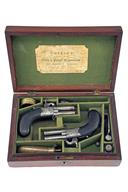 with round turn-off 1 5/8in. barrels, false rifling at the muzzles and engraved bands, engraved breech-blocks with London proofs, acanthus scroll engraved signed boxlock actions with radiused edges (light cleaning, some shallow pitting), central dolphin headed hammers and concealed folding automatic triggers, sliding safes to the top-tangs and finely chequered walnut bag-shaped butts with oval escutcheons to the wrists, complete with their maker's mahogany storage case relined and compartmented in green baize and complete with a probably associated mould with barrel-key combined, an oil bottle, turn-screw and bag-shaped flask, the original parchment 'Collins' trade-label to inside of lid