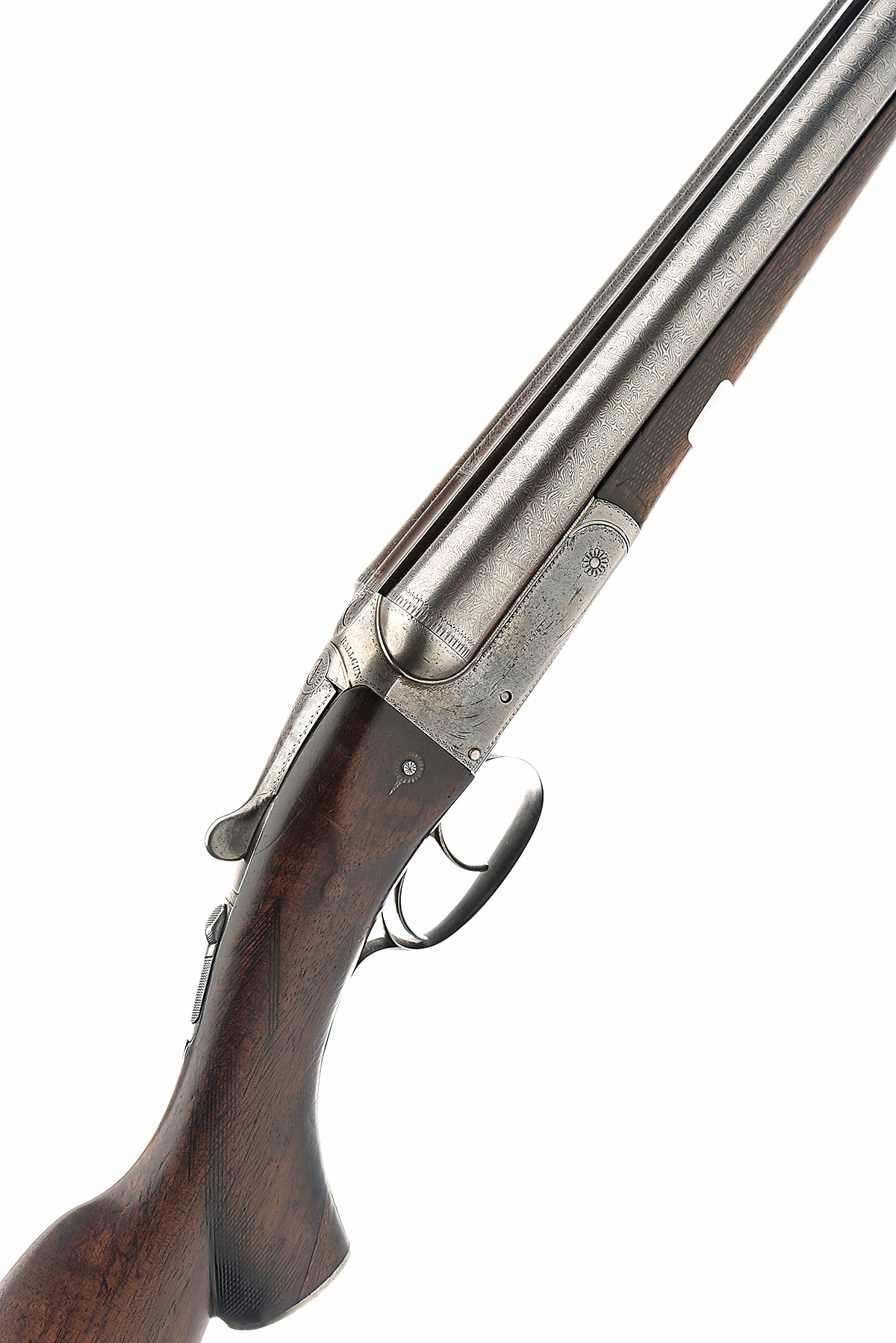 circa 1880. 28in. nitro reproved (in 2003) damascus barrels (loose, some pits), the rib engraved 'J. & W. TOLLEY. 59 NEW BOND ST. LONDON. W.', 2 3/4in. chambers, bored approx. imp cyl. choke in both, action incorporating Anson & Deeley patent action, patent no. 1756 of 11th May 1875, use number 3958, Westley Richards patent toplever, top of the action engraved 'UBIQUE BALL GUN', automatic safety with gold-inlaid 'SAFE' detail, border engraving, bright finish, 14 1/2in. pistolgrip stock (pinned at head, chequering worn smooth), including buttplate, with pistolgrip cap, fore-end with Deeley and Edge release catch (spit forward of knuckle, chequering worn smooth), weight 7lb. 4oz.