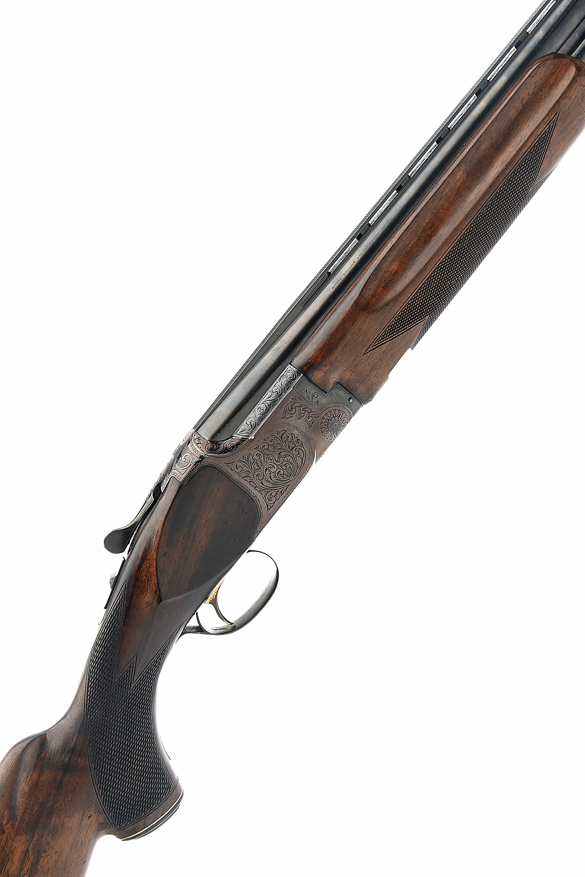 MIROKU FIREARMS MFG. CO. 12-BORE SINGLE-TRIGGER OVER AND UNDER EJECTOR, serial no. 607004, circa 1973, 26in. nitro barrels with 10mm ventilated matt top-rib, 2 3/4in. chambers, bored approx. imp. cyl. in both, hold-open toplever, manual safety with integral barrel selector switch, gold-washed single trigger, beaded border and acanthus scroll engraving, 14in. pistolgrip stock including buttplate, weight 7lb. 9oz.
