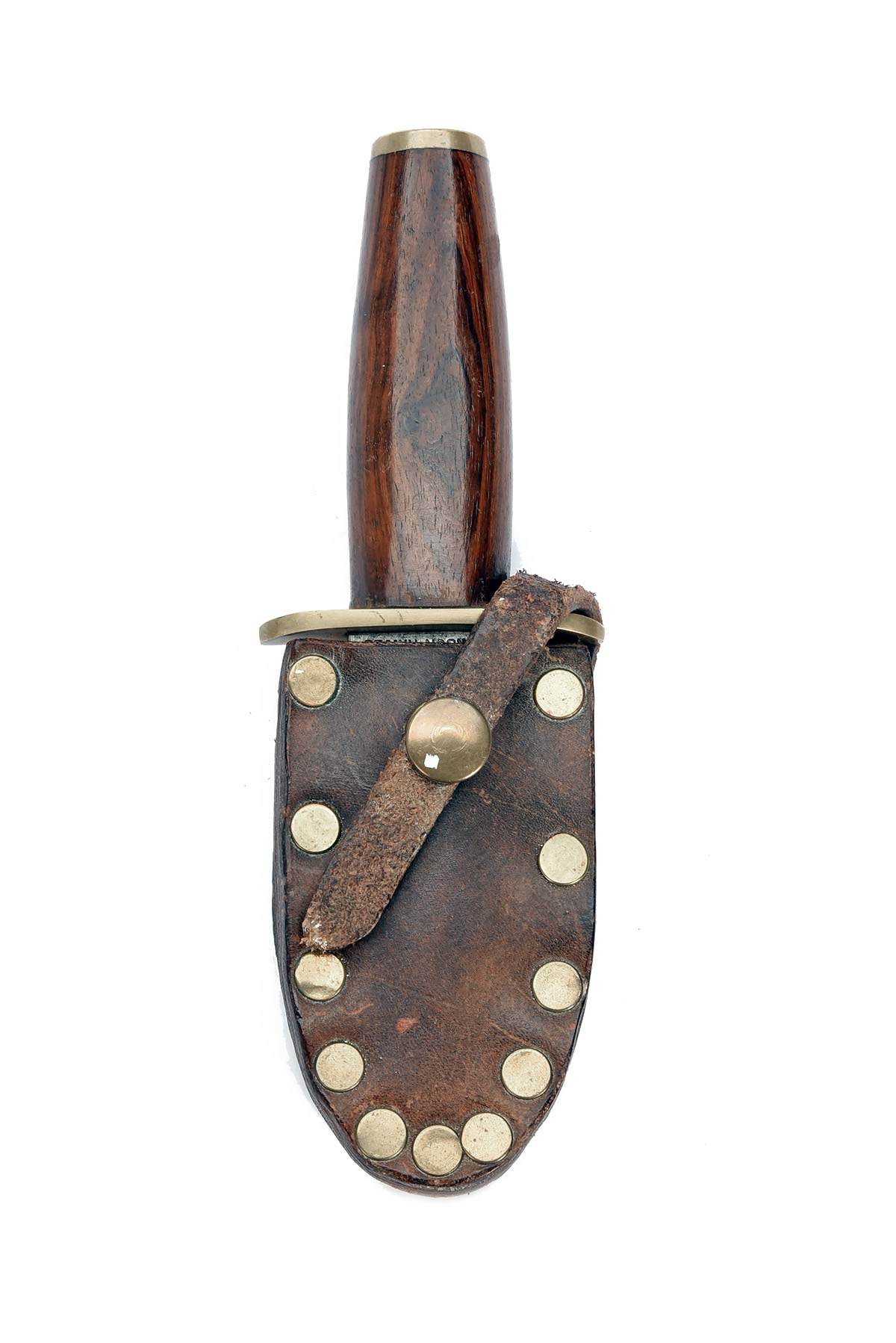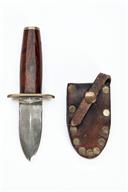 A SHORT DAMASCUS-BLADED DOUBLE-EDGED DICKSON GAME SKINNING KNIFE IN SHEATH, with broad 3 1/4in. blade marked 'DICKSON KNIVES' at the forte, brass oval cross-guard, smooth rounded wood hilt with brass pommel-cap and complete with its heavy duty leather belt sheath