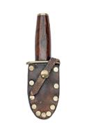 A SHORT DAMASCUS-BLADED DOUBLE-EDGED DICKSON GAME SKINNING KNIFE IN SHEATH,