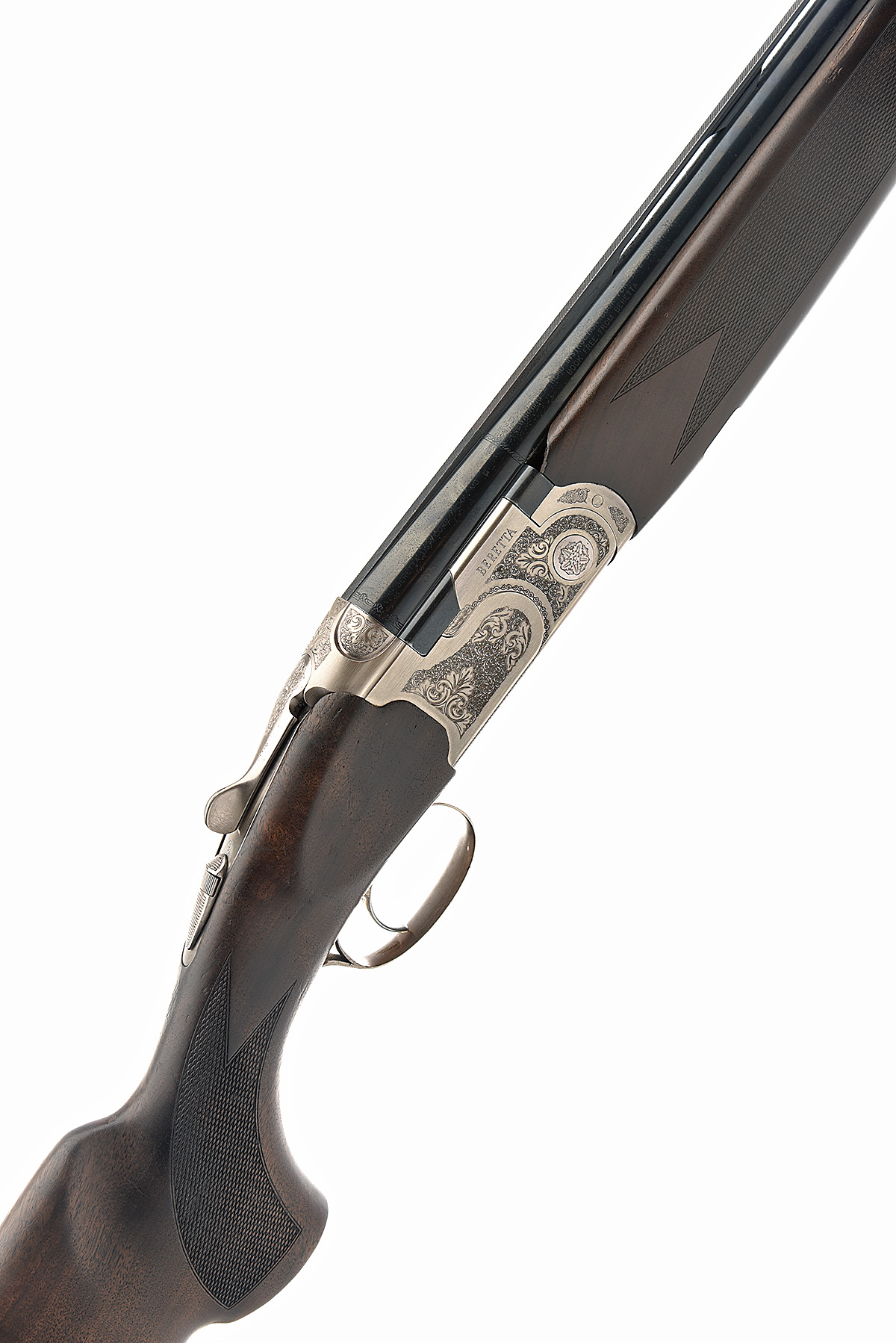 P. BERETTA 12-BORE (3IN.) '686 SILVER PIGEON I' SINGLE-TRIGGER OVER AND UNDER EJECTOR, serial no. R98981S, for 2011, 30in. steel-shot proved nitro barrels with 6mm ventilated matt rib, 3in. chambers, multichoke (no spares), applied 'SOUTH WEST SHOOTING' sticker to barrel, hold-open toplever, hold-open toplever, automatic safety with integral barrel-selector switch, gold-washed trigger, acanthus scroll engraving, satin finish, 14 3/4in. pistolgrip stock (crack to rear of top tang, blown out around top tang) including rubber recoil pad, weight 7lb. 6oz.