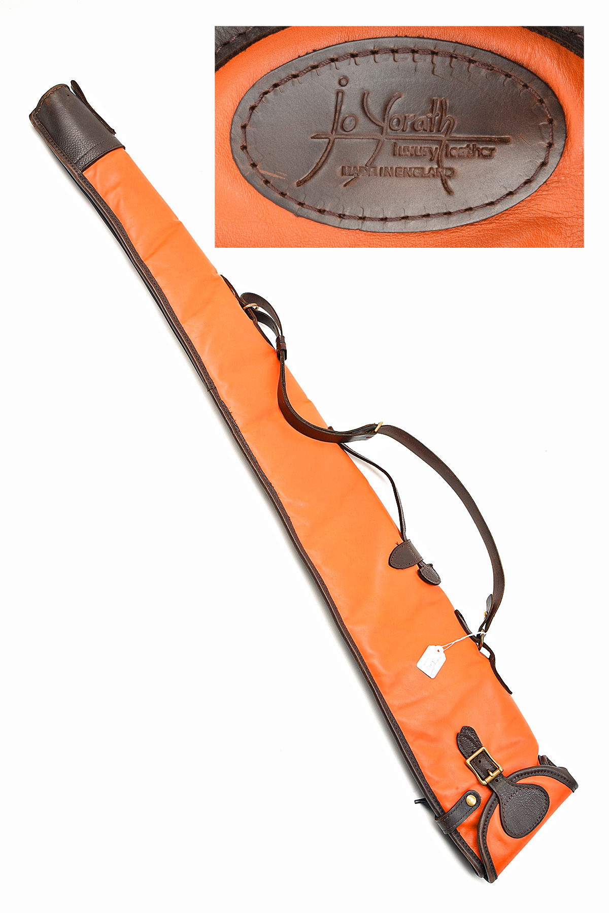 A JO YORATH ORANGE LEATHER FLEECE-LINED SINGLE GUNSLIP, with leather shoulder strap, brass fittings, measuring approx. 52 1/2in.