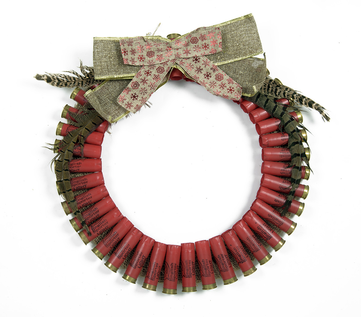 SHOTGUN CARTRIDGE CHRISTMAS WREATH, 'A 15" shotgun cartridge Christmas wreath using Lyalvale English sporter light fibre cartridges and pheasant feathers' 1