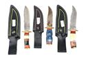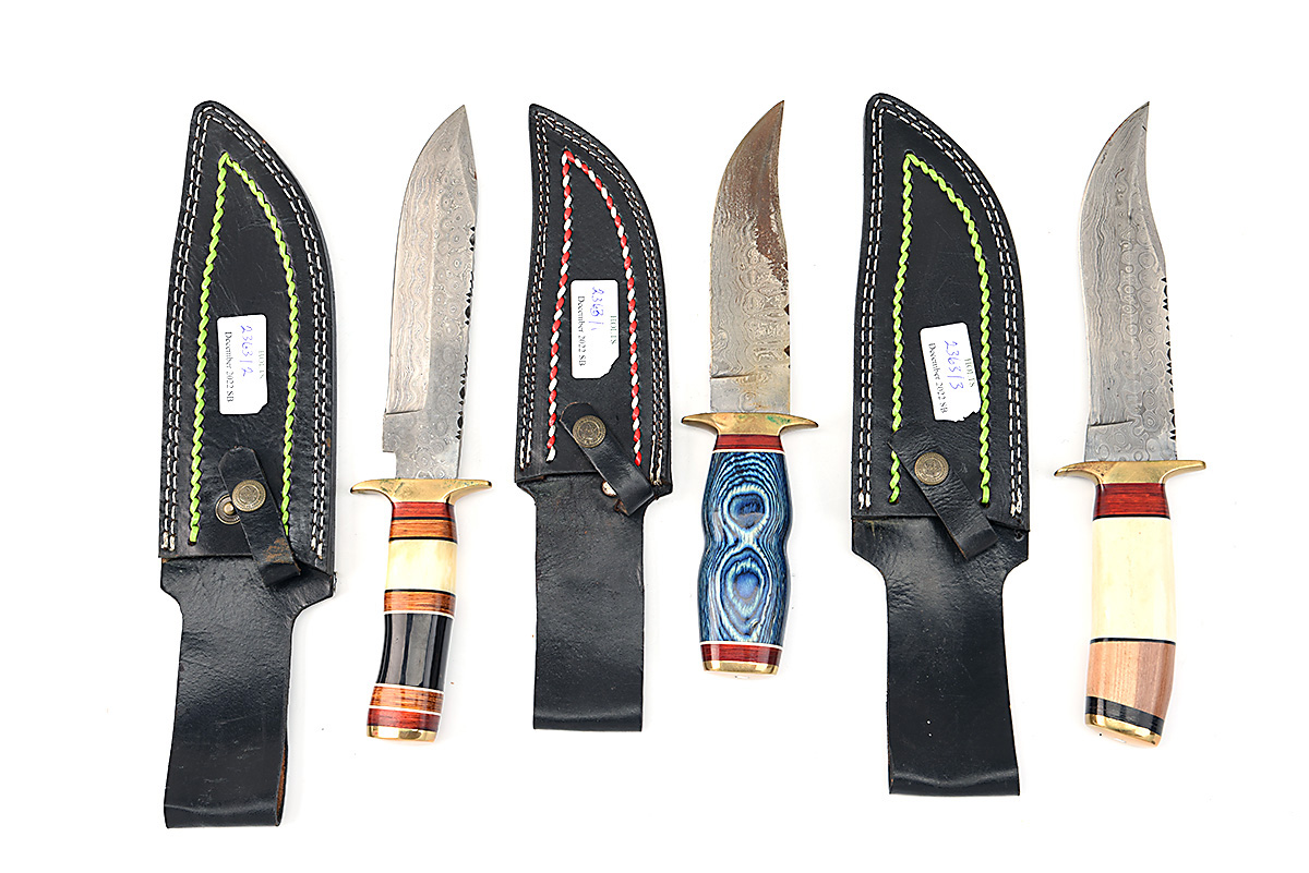 THREE SMALL BOWIE TYPE KNIVES WITH ROSE DAMASCUS BLADES,