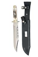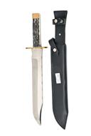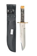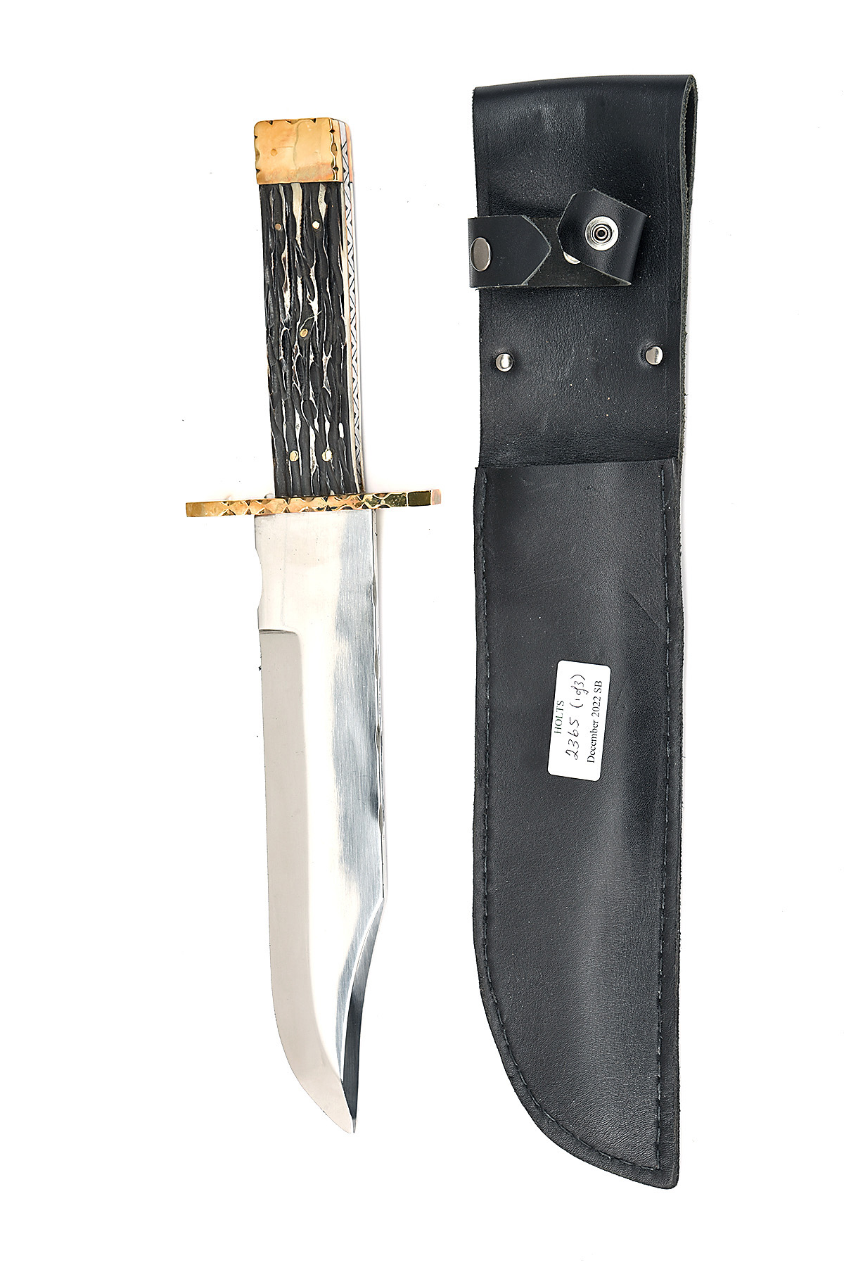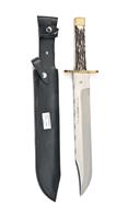 THREE LARGE BOWIE KNIVES WITH SHEATHS, the first with massive 14in. blade, etched 'HAND MADE R. COOPER SHEFFIELD ENGLAND', with heavy brass crossguard and two piece staghorn grips, the second with 10in. blade, stamped at top 'J NOWELL & SONS, SHEFFIELD', fitted with two piece staghorn grips, the third also with 10 in blade etched 'HAND MADE R. COOPER SHEFFIELD ENGLAND', and fitted with two piece staghorn grips, all three in as new unused condition and complete with their black leather sheaths