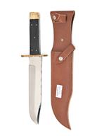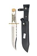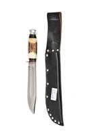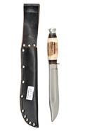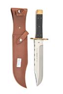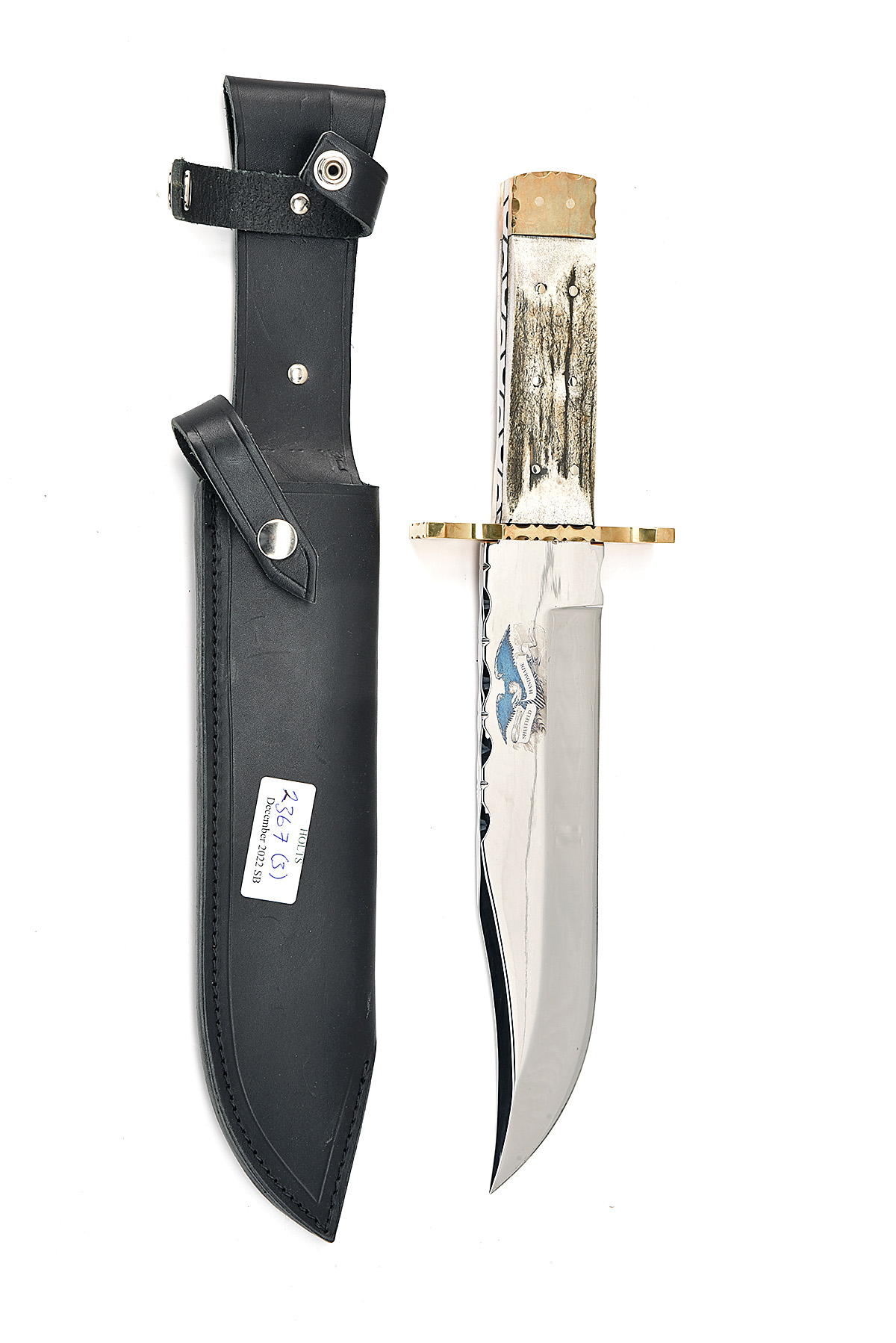 TWO LARGE BOWIE KNIVES AND ONE LARGE SHEATH KNIFE, the first with 10in. blade etched 'HAND MADE R. COOPER SHEFFIELD ENGLAND', two piece wooden grips, still in original wrapping, the second also with 10in. blade etched with the Wolstenholm eagle cypher over 'SHEFFIELD HAND MADE', with two piece staghorn grips, as new, both with leather sheaths, the third with 7 1/2in. blade and staghorn grip with aluminium pommel contained in incorrect black leather sheath,