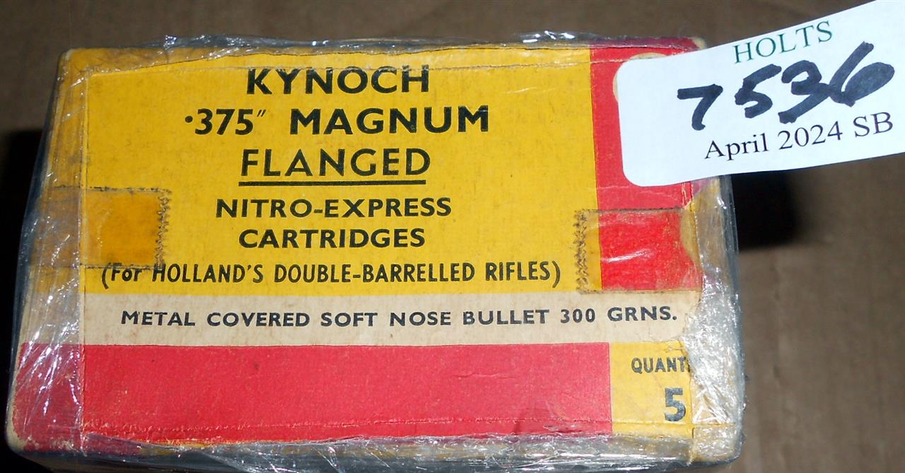40 ROUNDS .375 MAGNUM FLANGED NITRO EXPRESS AMMUNITION BY KYNOCH BATCH 6HP Please be advised that cartridges/ammunition, primers, primed cases, blanks and percussion caps CANNOT BE SENT ANYWHERE in the UK or EXPORTED OVERSEAS by POST or CARRIER. Due to this NATIONAL and INTERNATIONAL CARRIER rule, within 30 days of the sale date, please arrange collection with our shipping department from our Norfolk HQ. If payment and collection is not arranged within 30 days of the sale date, that will indicate that the items are not required and they will be disposed of.