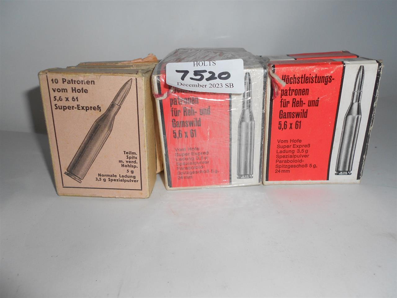 99 ROUNDS 5.6 x 61 VOM HOFE AMMUNITION, 29 BY IWK & 70 BY GEHMAN, NVBN Please be advised that cartridges/ammunition, primers, primed cases, blanks and percussion caps CANNOT BE SENT ANYWHERE in the UK or EXPORTED OVERSEAS by POST or CARRIER. Due to this NATIONAL and INTERNATIONAL CARRIER rule, we ask you to arrange with our shipping department a collection within 30 days of the sale date. A collection can be arranged for you to COLLECT at one of our regional valuation days on mainland UK, or, you would be most welcome to COLLECT from our offices at PE31 6HA in Norfolk. If payment and collection is not arranged within 30 days of the sale date, that will indicate that the items are not required and they will be offered in our next sale.