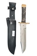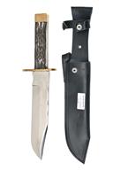 A LARGE BOWIE KNIFE TOGETHER WITH AND LARGE HUNTING KNIFE IN THE TRADITIONAL SCOTTISH DIRK STYLE, the first with 10in. blade etched 'HAND MADE R. COOPER SHEFFIELD ENGLAND', two piece staghorn grips, in as new condition with its black leather sheath, the second with 12 in. blade stamped ' JOHN NOWILL & SONS LTD / SHEFFIELD / EST. AD 1700' with curved staghorn grip with white metal stylised pommel, with its black leather scabbard, as new.