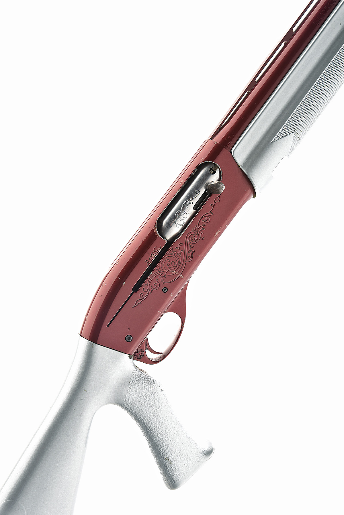 circa 1975, restricted magazine, 25 3/4in. nitro reproved (2016) barrel including cutts compensator with 7mm ventilated matt rib, 2 3/4in. chamber, action engraved with acanthus scroll work, the bolt carved en-suite, 13 1/2in. synthetic pistolgrip stock, the whole with candy apple red and dolphin blue finish