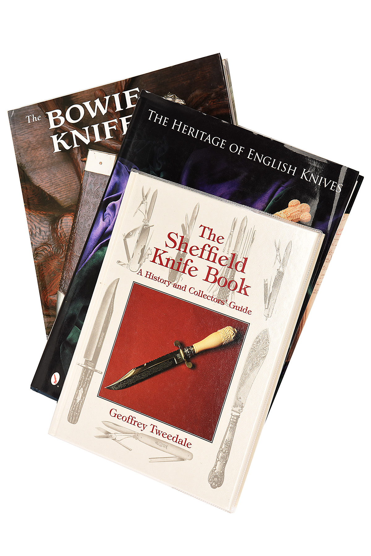 THREE REFERENCE BOOKS ON KNIVES, including The Bowie Knife Book by Norm Flayderman a standard reference work on the subject, and The Heritage of English Knives by David Hayden Wright, and The Sheffield Knife Book A History And Collectors Guide by Geoffrey Tweedale, three essential works for the knife collector