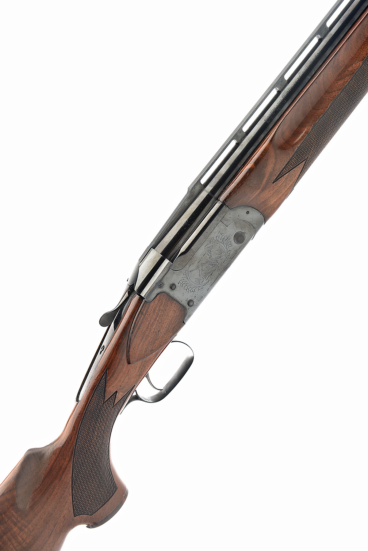 REMINGTON 12-BORE '3200 SPECIAL TRAP' SINGLE-TRIGGER OVER AND UNDER EJECTOR, serial no. 19919, for 1974, nitro reproved barrels with broad stepped ventilated matt top-rib with intermediate bead sight, no mid-rib, 2 3/4in. chambers, bored approx. imp. cyl. in both, hold-open toplever, safety catch missing, blacked action with scrollwork and pointers (some discolouration), 14 1/4in. pistolgrip stock (crack at head) with monte carlo comb, pistolgrip-cap, including 1in. ventilated rubber recoil pad, weight 9lb. 1oz.