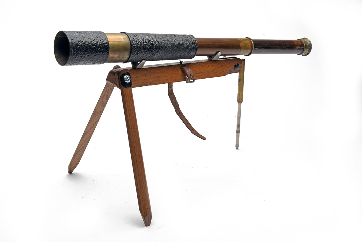A TELESCOPE WITH A WOODEN TRIPOD STAND, 'A three draw telescope with no visible makers mark in brown leather case and a J.Parker telescope stand' 2