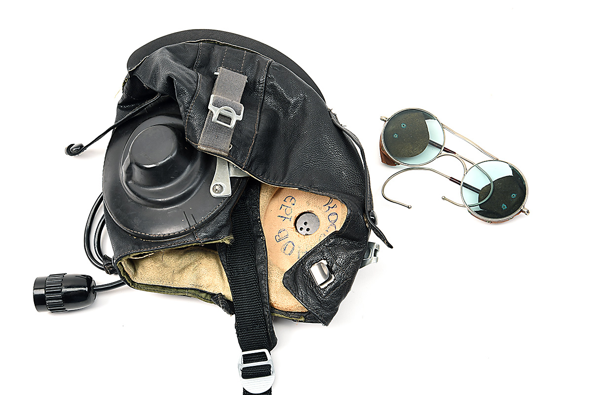 A RUSSIAN COLD WAR FLYING HELMET AND A PAIR OF VINTAGE DRIVING GOGGLES, (2)