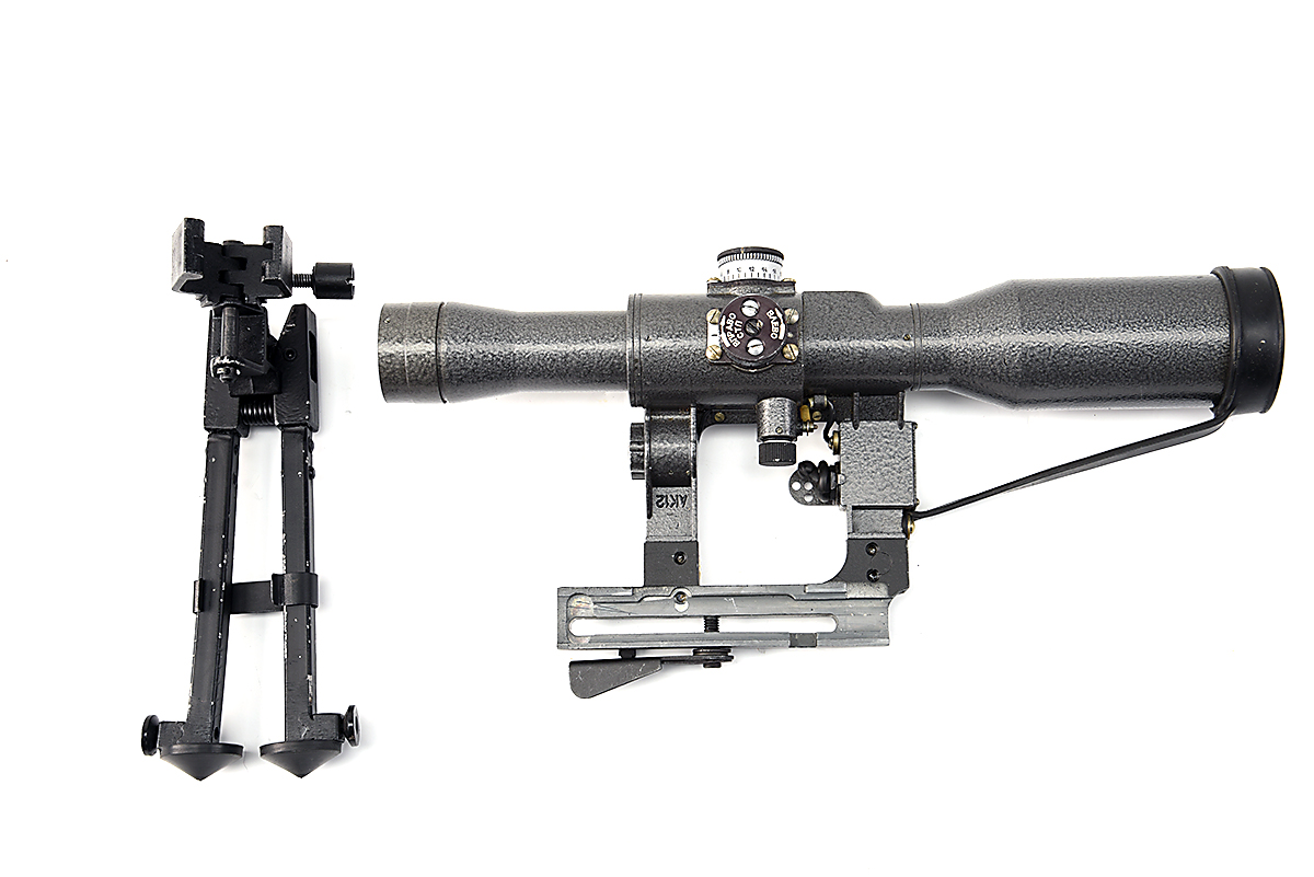 A RUSSIAN TACTICAL SCOPE FOR THE DRAGUNOV SNIPER RIFLE AND BI-POD,