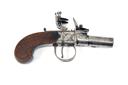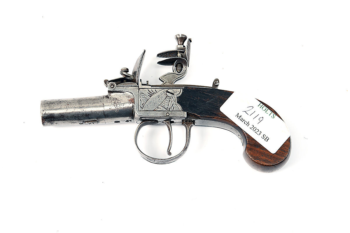 A 40-BORE FLINTLOCK BOXLOCK POCKET-PISTOL SIGNED JONES & CO., no visible serial number, circa 1800, with round turn-off 1 1/2in. barrel (frozen), Birmingham proofs, squared action with London signature, central cock and guarded trigger and walnut slab-sided butt