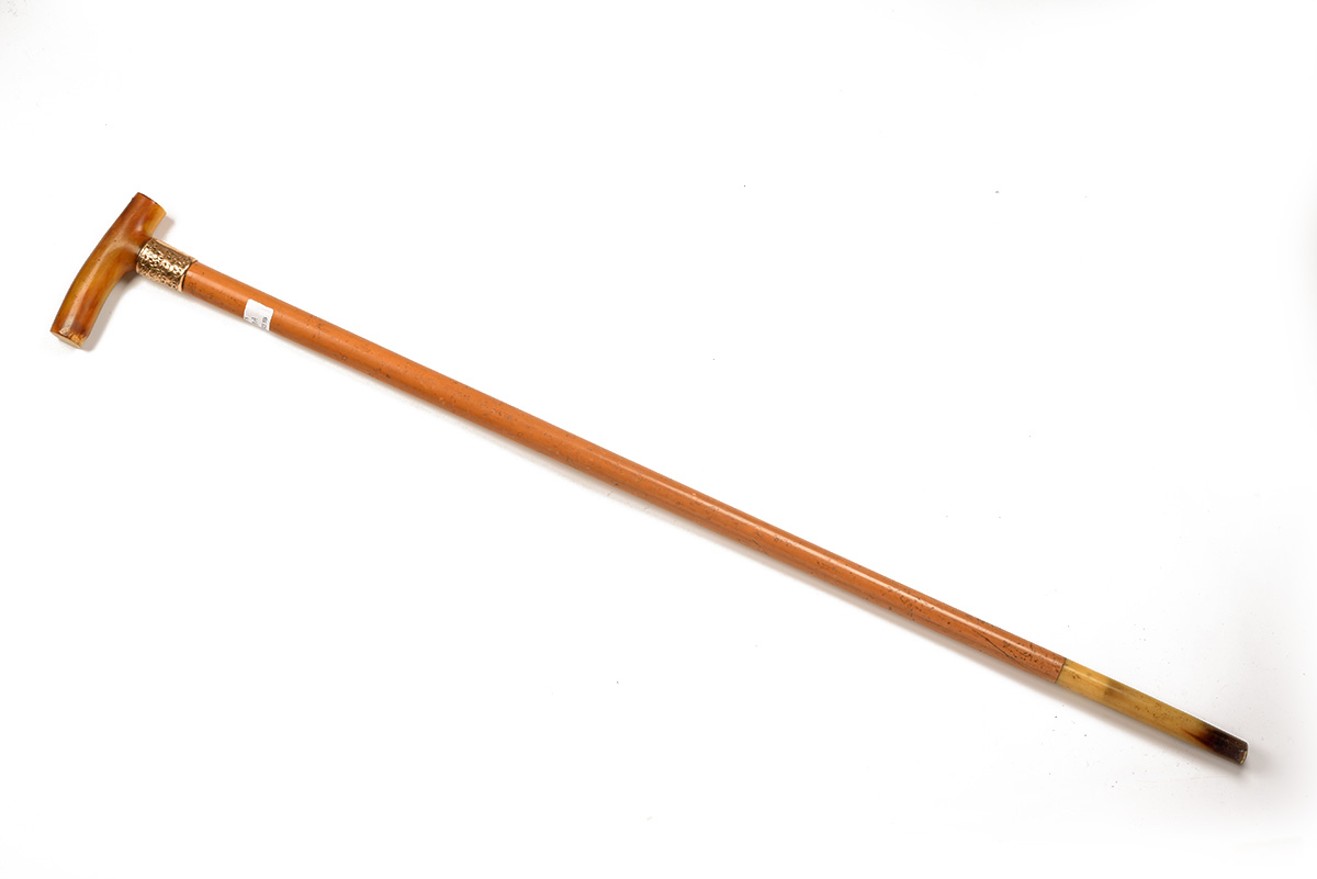 A 9K GOLD MOUNTED WALKING STICK, with Birmingham hallmarks for 1892, with horn tipped 34 1/2in. shaft, large scroll embossed 9k gold collar marked 'A.J. COCHRANE SEPT'R 1898' and 'T' bare horn handle