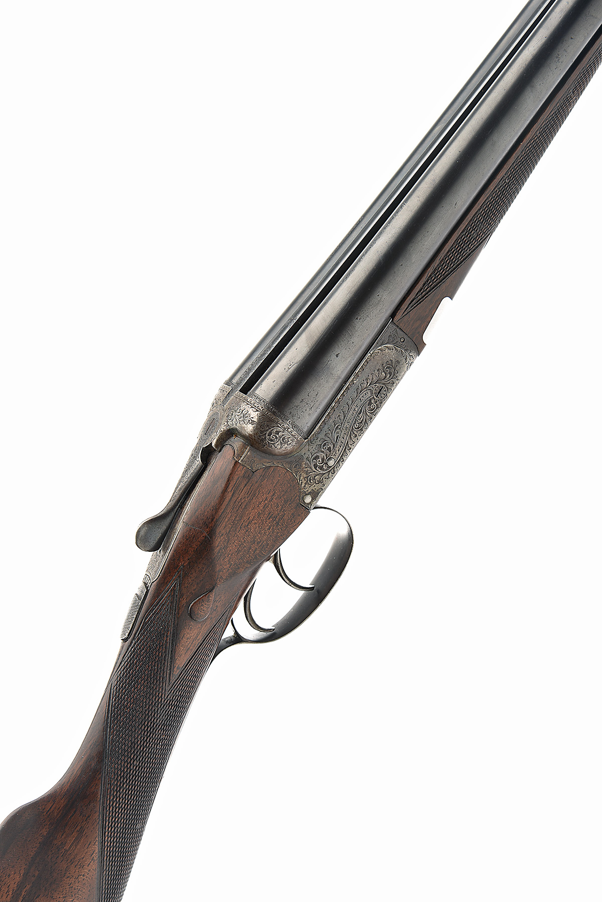 scoop-back treble-grip action, removable striker discs, automatic safety, border and acanthus scroll engraving, retaining some original colour-hardening and finish, 14 3/4in. stock (some repairs at head) including 1/2in. rubber recoil pad, weight 6lb. 3oz. (6lb. 2oz. sleeved), in a brass-cornered leather case with provision for both sets of barrels