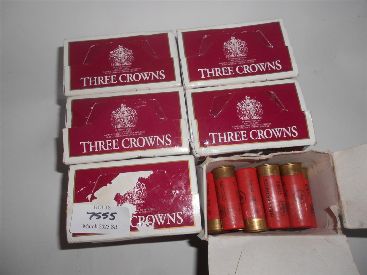 144 THREE CROWNS 12 BORE CARTRIDGES, 65mm, 32grm, 4 SHOT, FIBRE WAD Please be advised that cartridges/ammunition, primers, primed cases, blanks and percussion caps cannot be sent or exported to you by post or carrier. Due to this rule, within 30 days of the sale date, please arrange with our shipping department a collection at one of our regional valuation days on mainland UK, or, you would be most welcome to collect from our offices at PE31 6HA in Norfolk. If collection is not arranged within 30 days, that will indicate that the items are not required and they will be offered in our next sale.