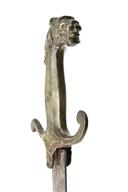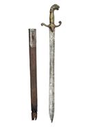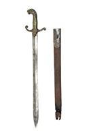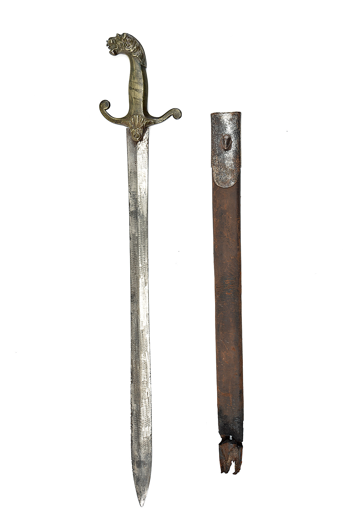 A RARE PRE-REGULATION REGIMENTAL BANDSMAN'S SWORD, circa 1820, with plain, double-edged 21 in. blade, brass hilt with raised cross-guard and lion's head pommel, together with an associated scabbard with steel locket, blade stained with edge nicks and surface rust to ricasso, lion's mouth loop broken and chain missing, scabbard unlikely to be original, with rusted locket and missing the lower 3 inches, 26 in. overall