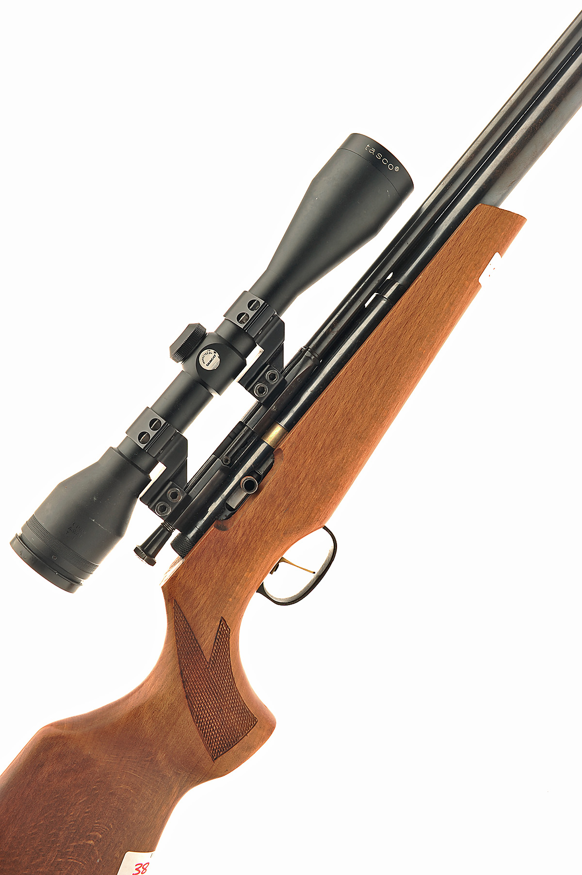 A .25 FAC RATED PRE CHARGED PNEUMATIC AIR RIFLE SIGNED BOWKETT Serial no 5RTM1, with a 27.5in. barrel including silencer, raised action block with dovetail groove fitted with a Tasco world class plus 4x44 telescopic scope in a beech right half stock.