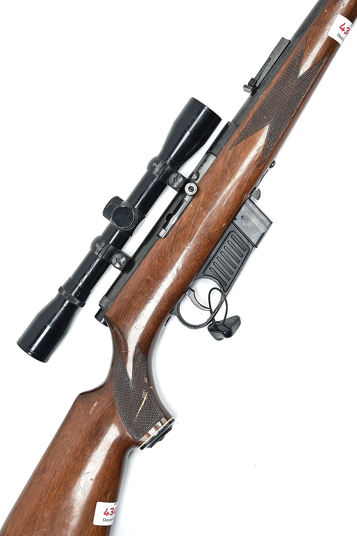 VOERE .22 L.R. SELF-LOADING SPORTING RIFLE, serial no. 168372, 21 1/4in. nitro barrel, threaded for sound moderator, fore-sight missing, tangent rear-sight, fitted with a Nikko Stirling 4x40 telescopic sight, manual safety, detachable magazine, pistolgrip stock, leather sling