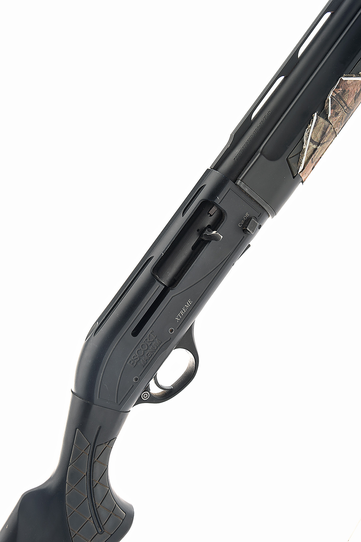 HATSAN 12-BORE (3IN.) 'ESCORT MAGNUM XTREME' SEMI-AUTO SHOTGUN, serial no. 442912, circa 2015, 28 1/2in. nitro barrel (steel shot proof) with 7mm ventilated matt top-rib, 3in. chamber, multichoke (no spares), magazine cut-off, 14 1/2in. synthetic pistolgrip stock, some camo tape to the fore-end