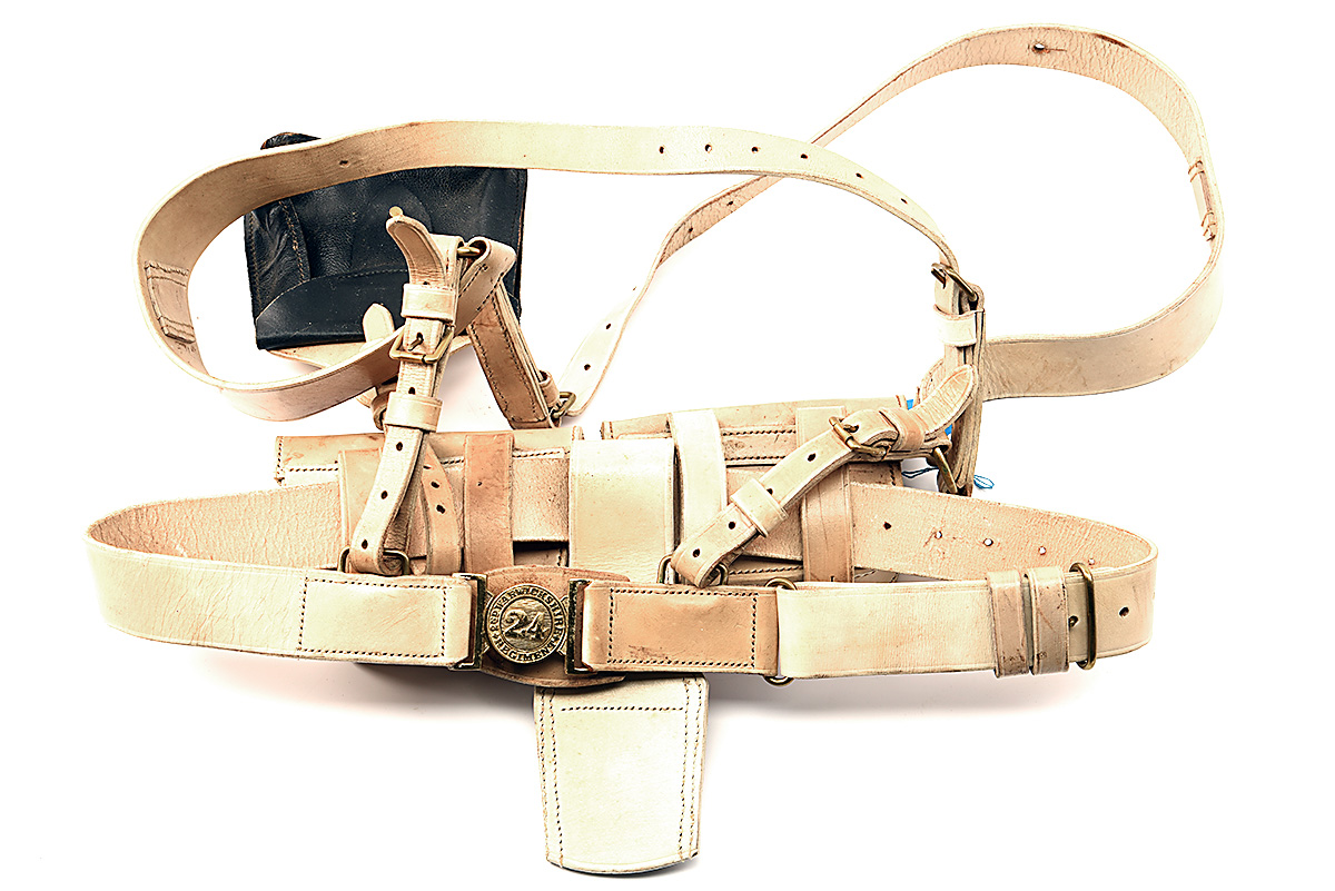 A REPRODUCTION SET OF PATTERN 1882 VALISE EQUIPMENT, comprising belt with buckle for the 2nd Warwickshire Regiment; cross-straps, x2 ammo pouches, additional pouch and bayonet frog, light wear only