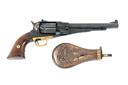 A BOXED REPRODUCTION PIETTA .44 PERCUSSION REMINGTON ARMY REVOLVER, serial no. 146669 with blued 8in. barrel, adjustable sights, plain cylinder, plain frame and smooth walnut grips, in its maker's card and polystyrene carton together with a reproduction powder flask
