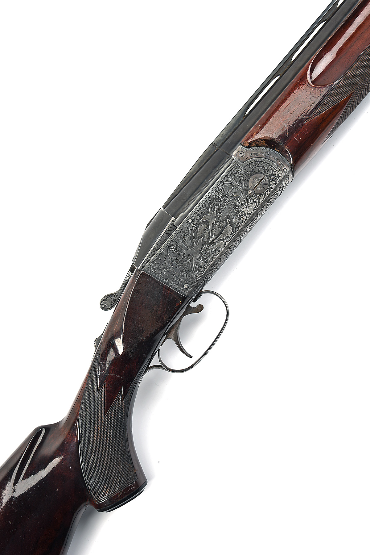 THE STOCK, ACTION AND FORE-END ONLY OF A KRIEGHOFF 12-BORE 'MODEL 32' SINGLE-TRIGGER OVER AND UNDER EJECTOR, serial no. 1374, with two sets of barrels for 1962, stock terminally cracked through at hand.