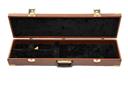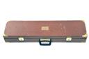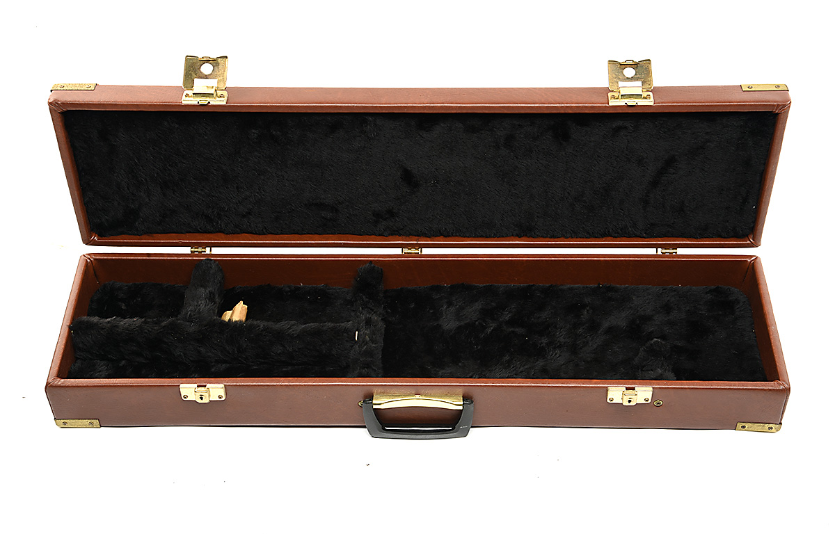 A BRASS-CORNERED LEATHERETTE, SINGLE GUNCASE, fitted for 32in. barrels, the interior lined with brown fur, 2 brass clasp locks, keys missing, the lid exterior with a blank brass plaque